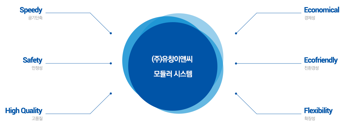 특히 현장시공과 공장생산을 동시에 진행하여 기존의 공법보다 절반 이하로 공기단축이 가능하고 완공 후 건물의 증축이나 확장, 이축 등이 용이합니다.