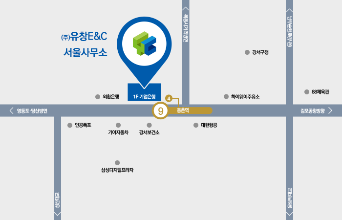 "등촌역, 강서보건소" 버스정류장에서 하차 후 기업은행 건물 5층 정류장번호 : 16-003, 16-004 |